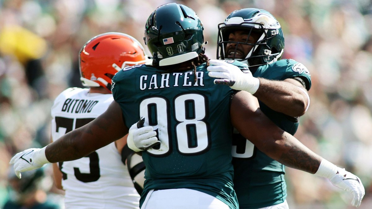 2YAER7W Philadelphia Eagles defensive end Brandon Graham (55) and Philadelphia Eagles defensive tackle Jalen Carter (98) celebrate during an NFL football game against the Cleveland Browns, Sunday, Oct. 13, 2024 in Philadelphia. (AP Photo/Daniel Kucin Jr.)