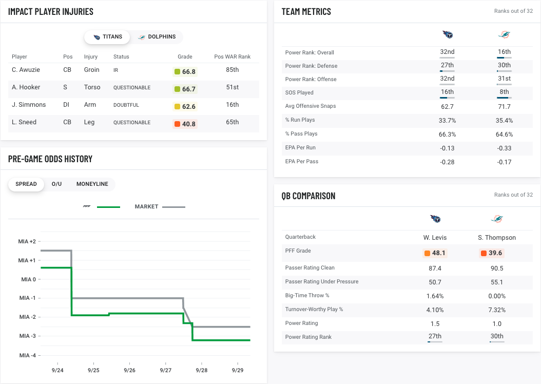 • PFF predictions and real time spread, moneyline and over/under lines for each NFL game.