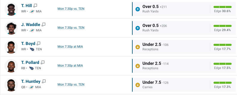 • WR Jaylen Waddle, Miami Dolphins — over 0.5 rushing yards: Although Dolphins receivers have attempted just three rushes this season, two have gone to Waddle, including one backward screen pass. He has eclipsed this line in two games this season.