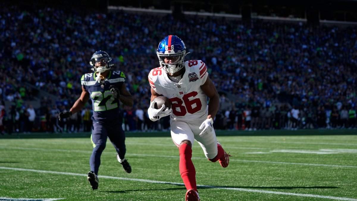 2Y8T5P1 New York Giants wide receiver Darius Slayton (86) scores a 30-yard touchdown ahead of Seattle Seahawks cornerback Tre Brown (22) during the second half of an NFL football game, Sunday, Oct. 6, 2024, in Seattle. (AP Photo/Lindsey Wasson)