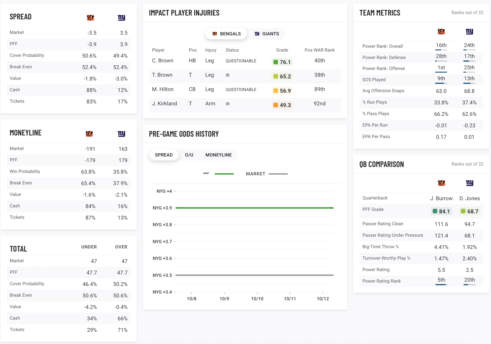• PFF predictions and real time spread, moneyline and over/under lines for each NFL game.