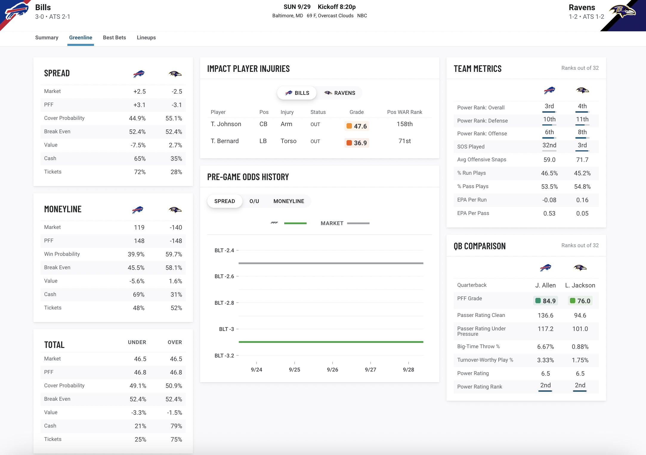 • PFF predictions and real time spread, moneyline and over/under lines for each NFL game.