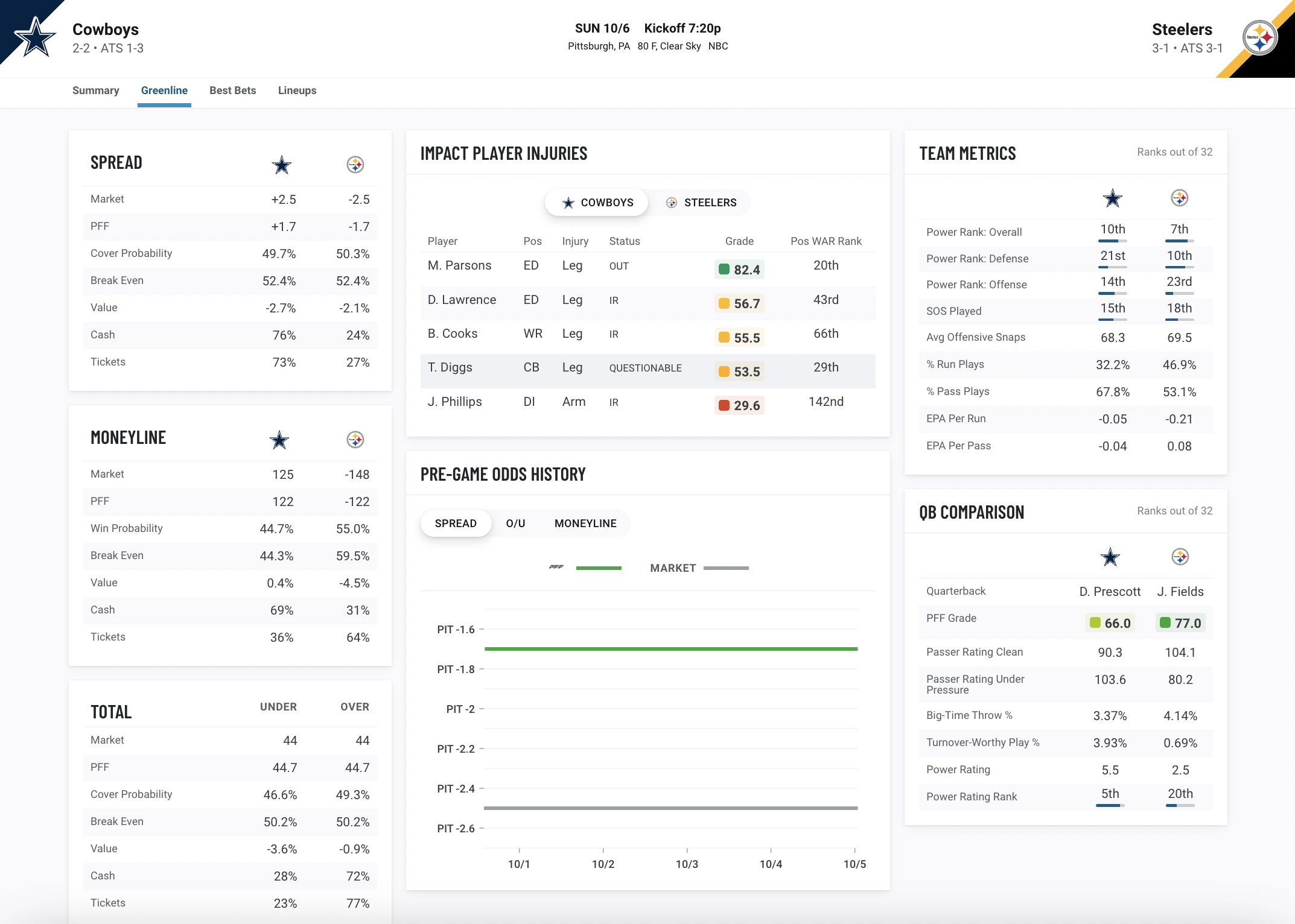• PFF predictions and real time spread, moneyline and over/under lines for each NFL game.