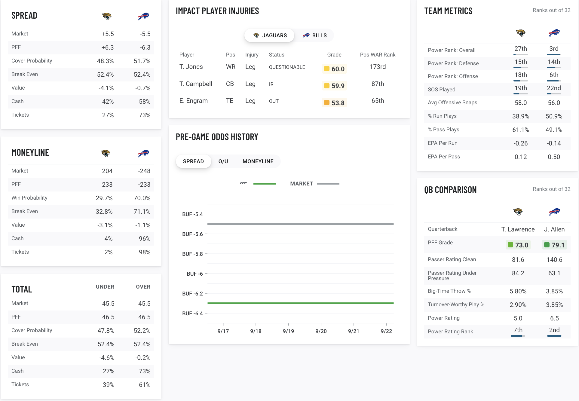 Jacksonville Jaguars vs Buffalo Bills: Over 45.5 total points scored (-105): 1% PFF Greenline Edge