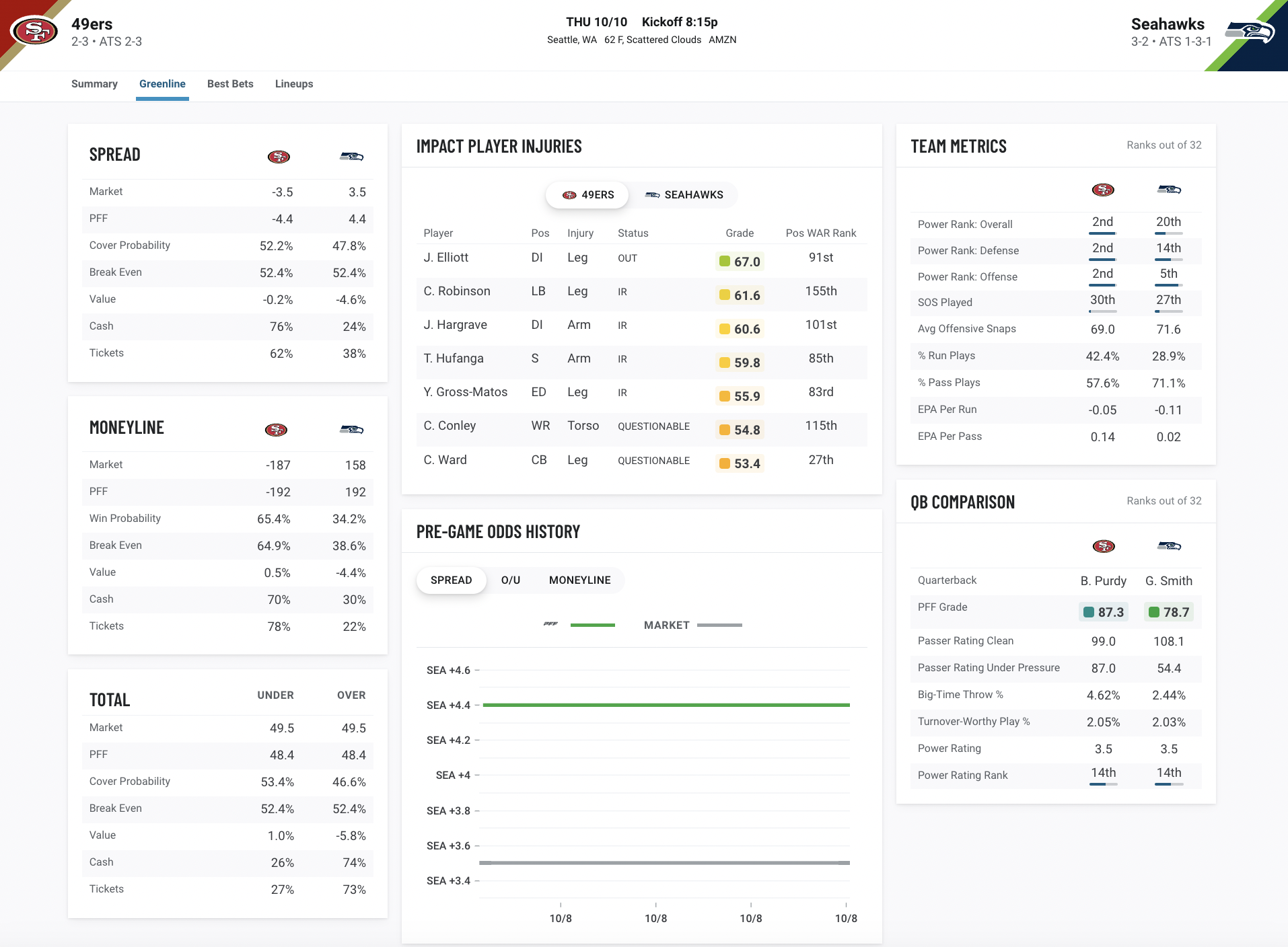 • PFF predictions and real time spread, moneyline and over/under lines for each NFL game.