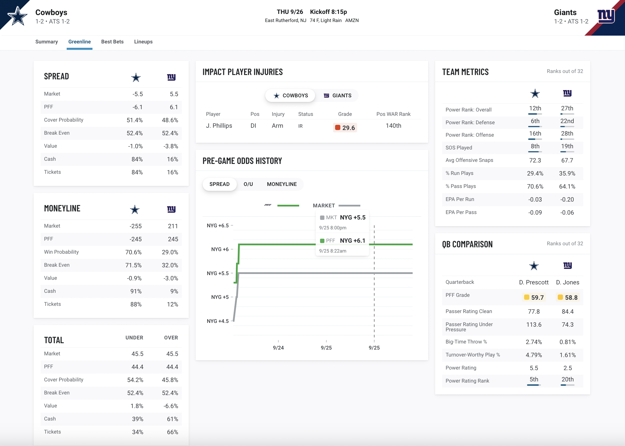 The Giants are coming off a huge upset victory in Cleveland, winning a game outright in which they were 6.5-point underdogs. The team found itself up a pair of scores heading into the second half and unleashed its pass rush on Deshaun Watson, racking up 10 sacks on 41 total pressures — 11 more than any other team in Week 3.