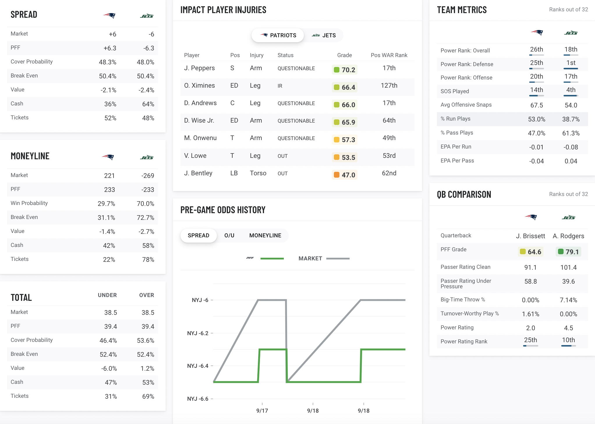 • PFF predictions and real time spread, moneyline and over/under lines for each NFL game.