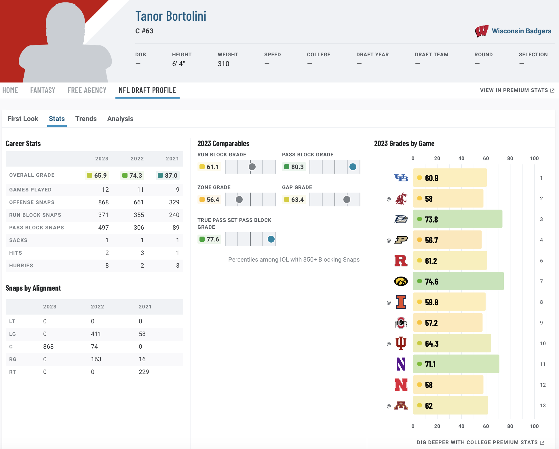 He is a bit undersized at his position, which tends to pop up in his run blocking, where his grade dropped in each of the past three seasons, bottoming out at 61.1 in 2023. On the contrary, his pass blocking improved in every year of his college career, topping out at 80.3. He surrendered just 23 career pressures across 962 pass-blocking snaps. While Bortolini may need to bulk up a bit, his athleticism is extremely rare for his position and would make him a very interesting pick on Day 3.