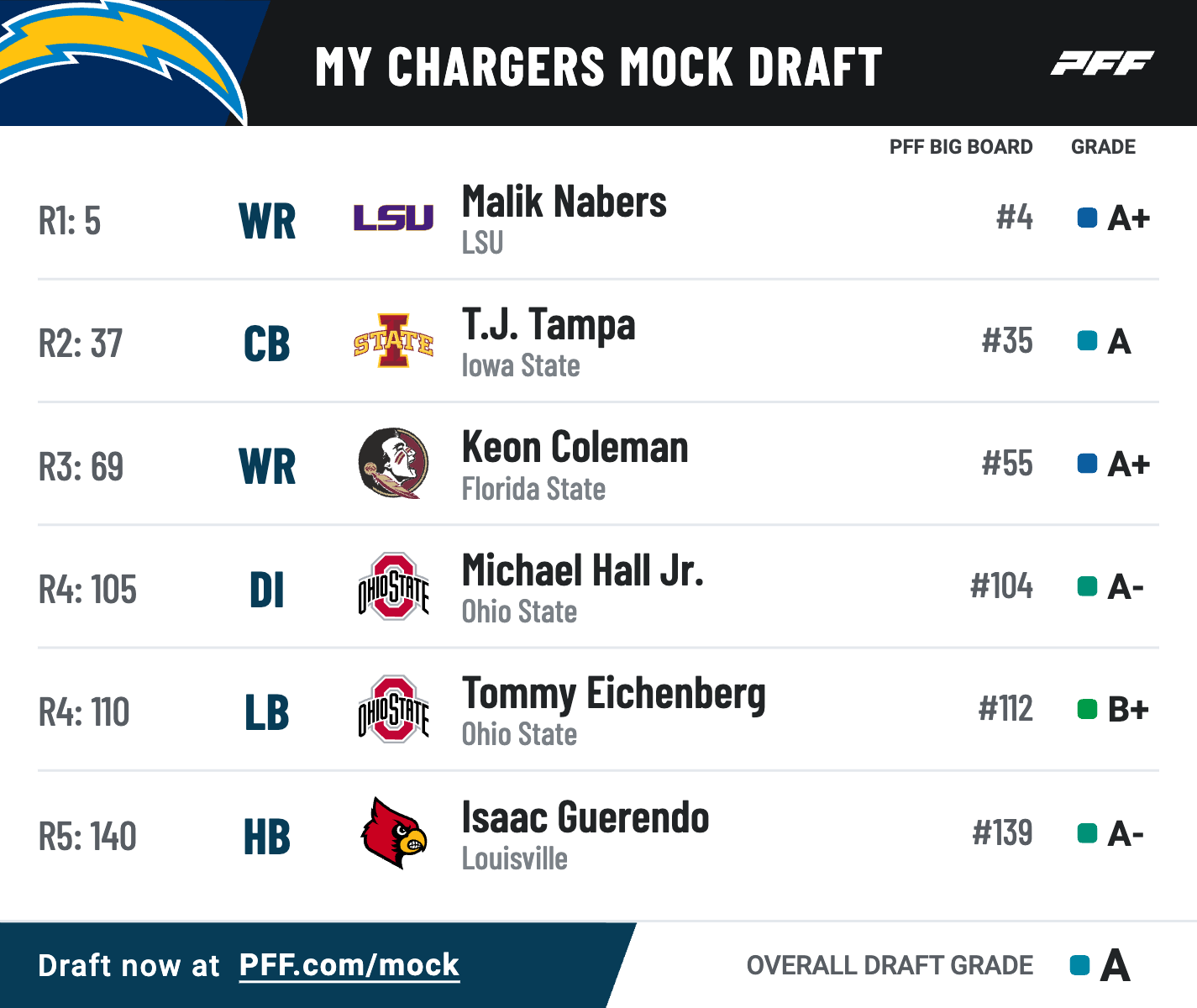 • Draft and trade for yourself: Try PFF's Mock Draft Simulator — trade picks and players and mock for your favorite NFL team.