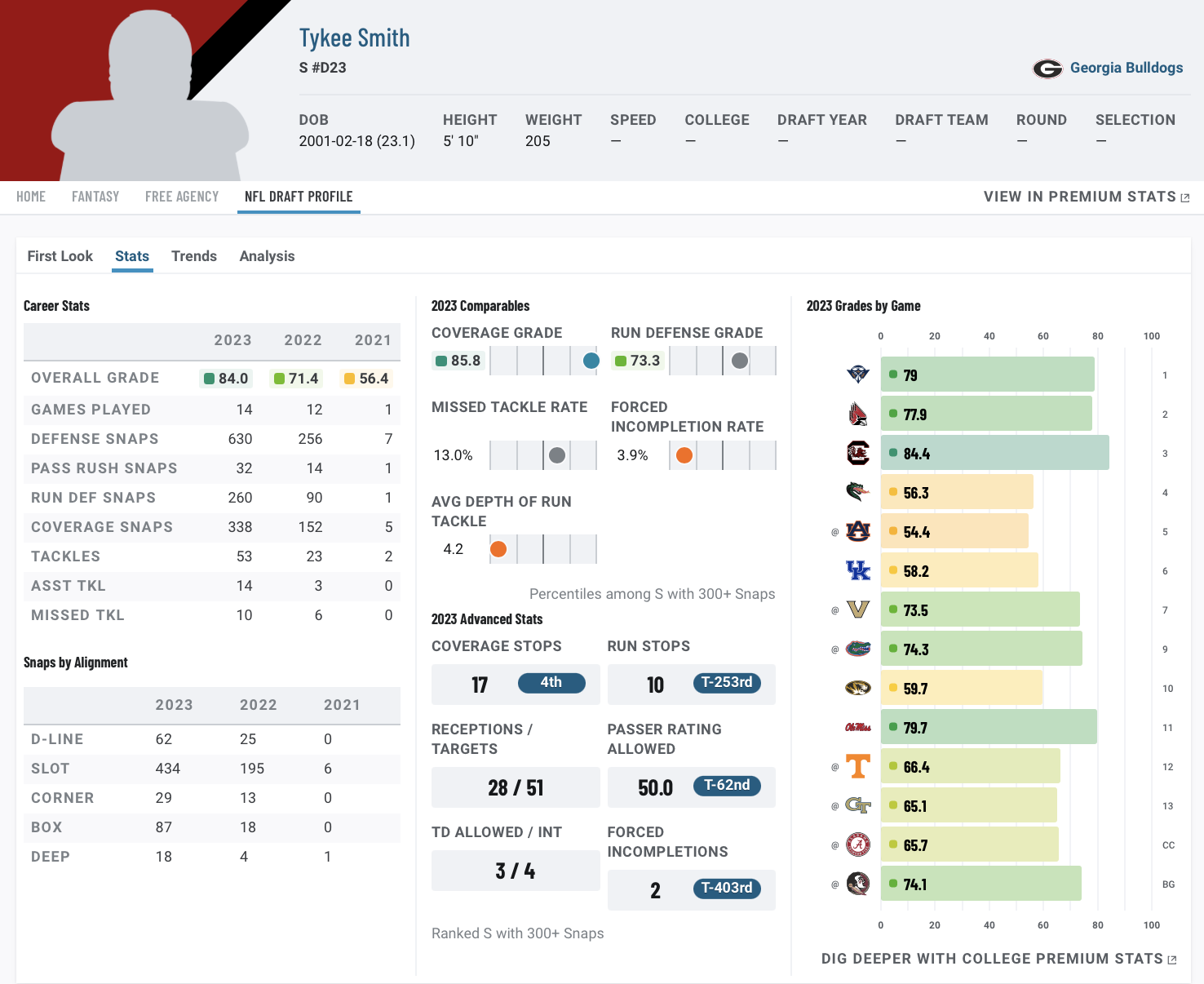 Despite Georgia’s run to its first national championship in over 40 years, the team did it largely without Smith, as an ACL injury limited him to just seven snaps in 2021. He saw little playing time upon his return in 2022, as he largely took on a reserve role within a stacked Bulldogs defense that repeated as champions, but he showed signs that he was recovering nicely, as he put up a 71.4 PFF grade.