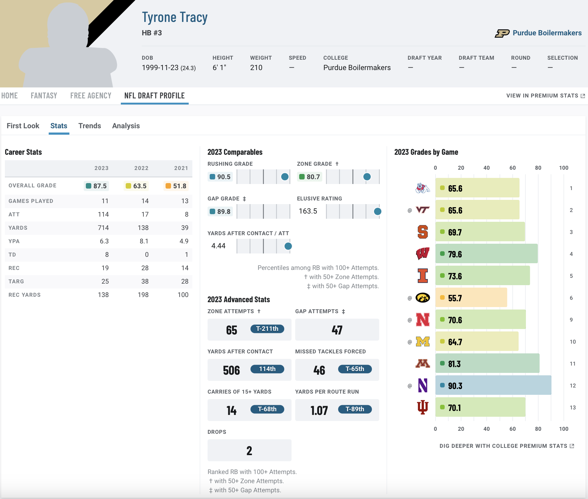Tracy rushed for 714 yards and forced 46 missed tackles in his first full season at running back. He led all Big Ten rushers in forced missed tackle rate and averaged 4.4 yards after contact (third).