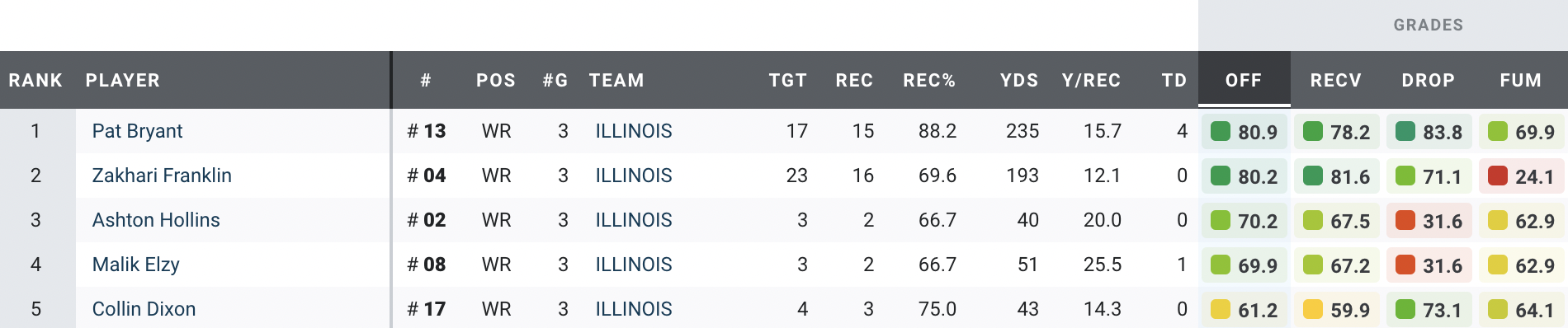 • Tommi Hill faces Illinois’ stud wide receivers: Bryant is your more traditional “X” receiver who does his best work with strength and in contested-catch situations, whereas Franklin wants to create separation via his route running.