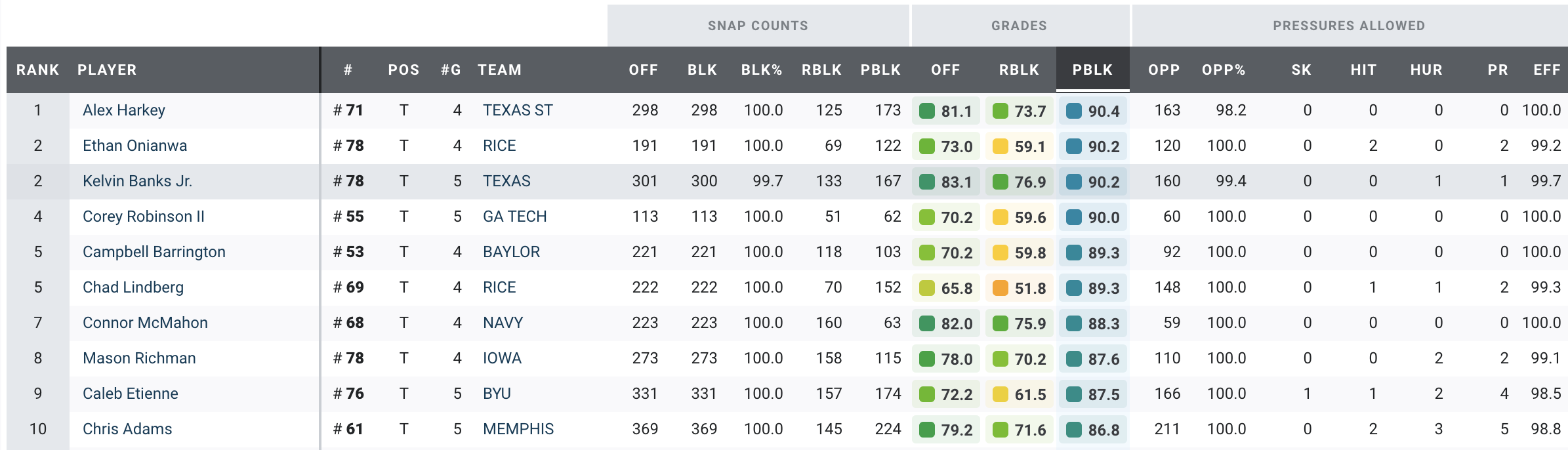 Banks is a smooth mover for his size and one of the highest-graded offensive tackles in the nation (83.2). His 90.2 pass-blocking grade is tied for the second-best mark in the nation through five weeks.