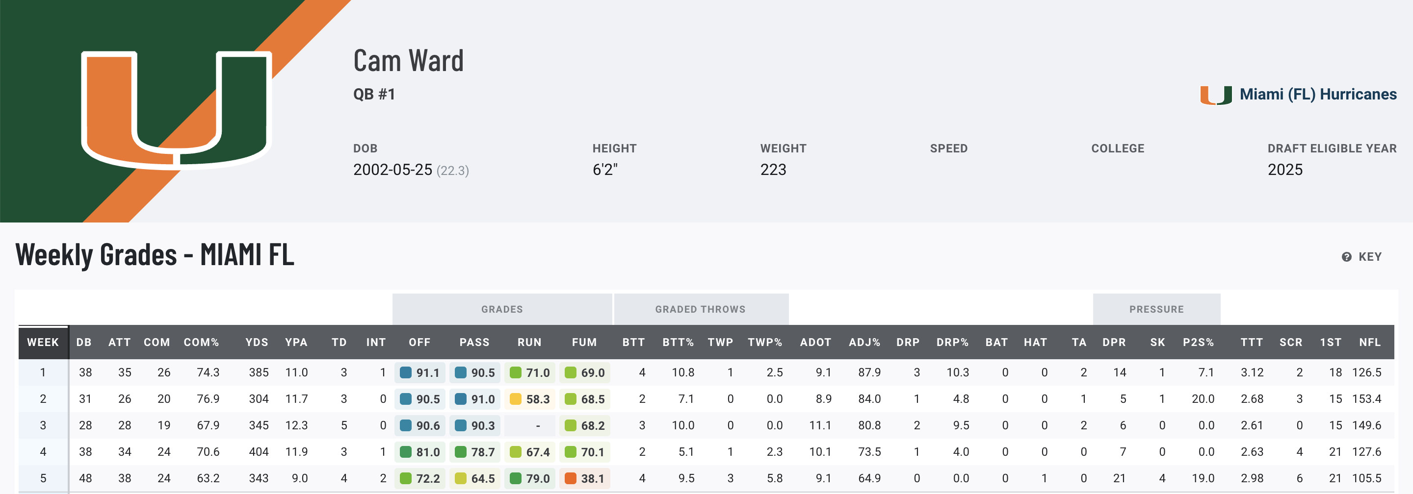 • Miami QB Cam Ward lands in the Big Apple: The end could be near for many current Giants players and decision-makers. Cam Ward is having a Heisman-like season, putting up an impressive 8.7% big-time throw percentage and a 91.2 passing grade through five weeks.