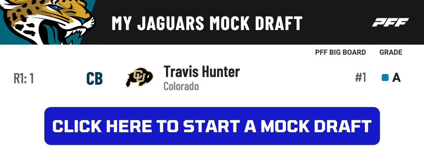 • Colorado CB/WR Travis Hunter goes No. 1 overall: The Jaguars need offensive line help, but Travis Hunter is too special to pass up. He’s one of the best wide receivers in the country (84.7 offensive grade) while simultaneously being one of the nation's top cornerbacks (85.1 defensive grade).