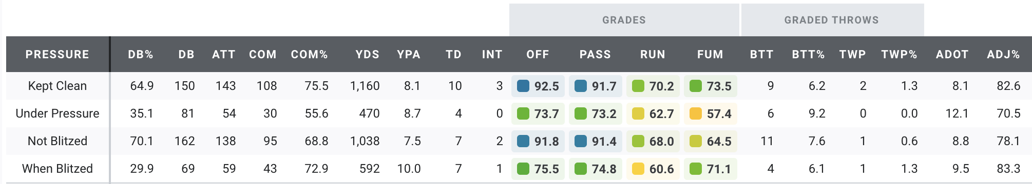 Milroe is having a fantastic season, highlighted by a massive win against Georgia, where he earned an 89.5 passing grade. He also posted an impressive 74.2 passing grade under pressure in the contest, significantly improving on one of his struggles last season.