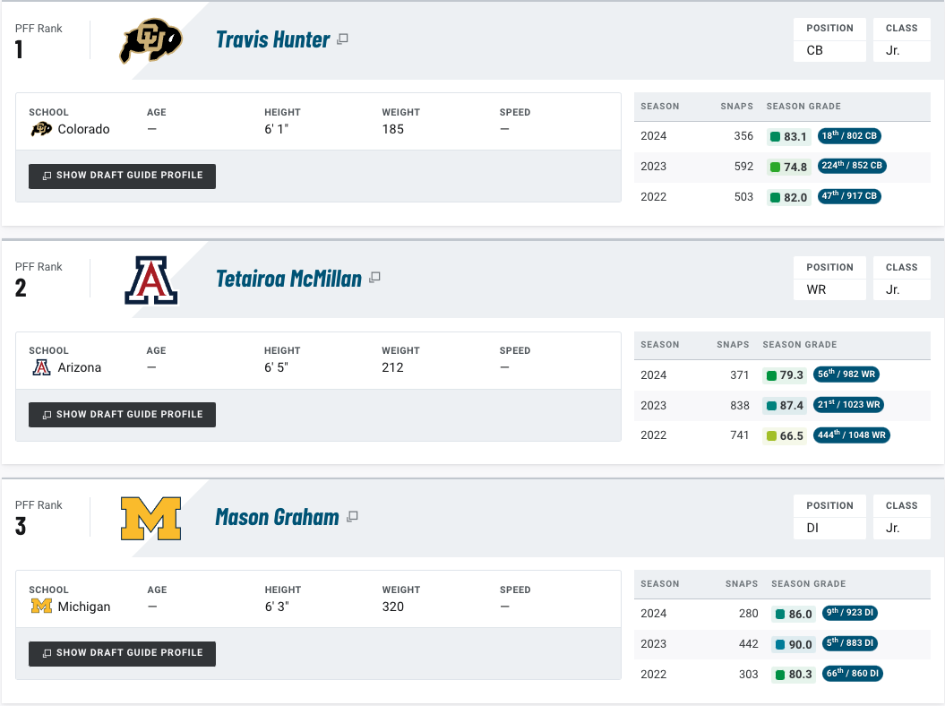 Milroe will compete with Colorado's Shedeur Sanders and MIami's Cam Ward to be the first quarterback off the board, but as things stand, he is the highest-ranked player at the position on PFF’s Big Board. He’s not making many mistakes, having posted just a 1.8% turnover-worthy play rate through seven weeks.