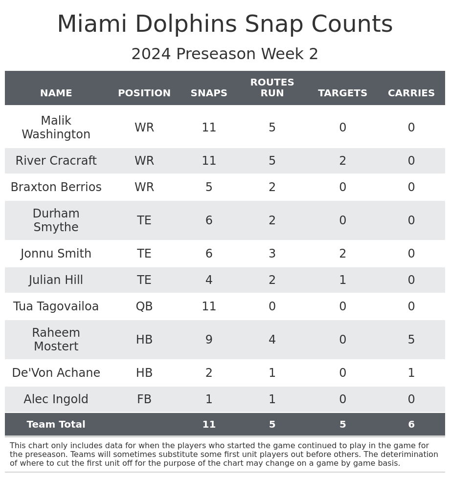 Smith played some snaps in 12 personnel, but it wasn’t the typical role. This was reminiscent of his time with the Tennessee Titans. While Smith is the Dolphins' clear top receiving tight end, it is very rare for someone to be a consistent fantasy starter without playing in the majority of 12 personnel snaps. There are better options if you’re looking for a deep sleeper at the position.