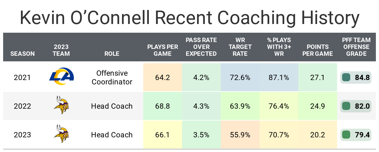 Over recent years, the Vikings quarterbacks have put up big numbers for fantasy football, largely thanks to Kevin O’Connell’s tendency to maintain a higher-than-expected pass rate, a trend likely to continue this season. The team has also run more plays in recent seasons.