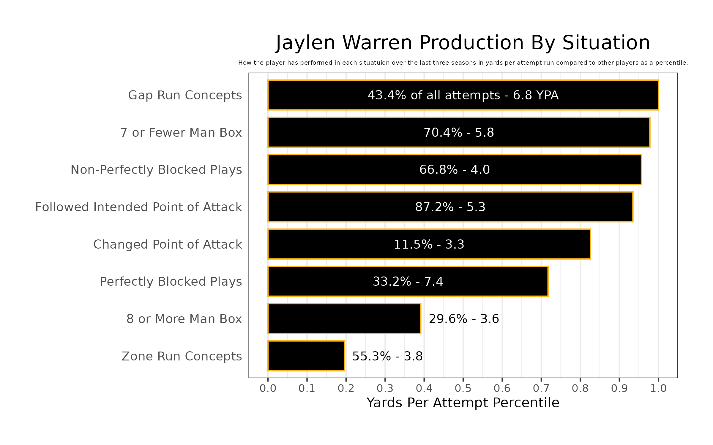 • Jaylen Warren dominates on the ground in most situations: The Pittsburgh Steelers running back ranks in the 90th percentile or better in half of the metrics tracked in PFF's player profile series.