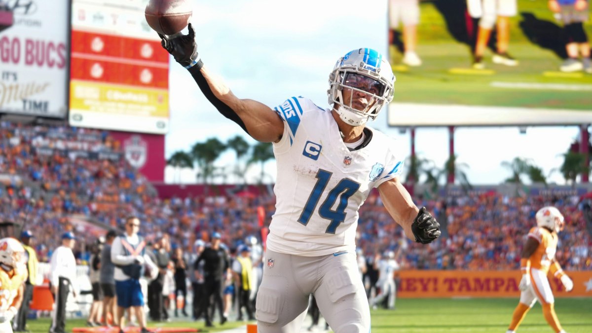 2T1X9RR Detroit Lions wide receiver Amon-Ra St. Brown (14) throws the ball hard agains the wall to celebrate his touchdown during an NFL football game against the Tampa Bay Buccaneers, Sunday, Oct. 15 2023, in Tampa, Fla. (AP Photo/Peter Joneleit)