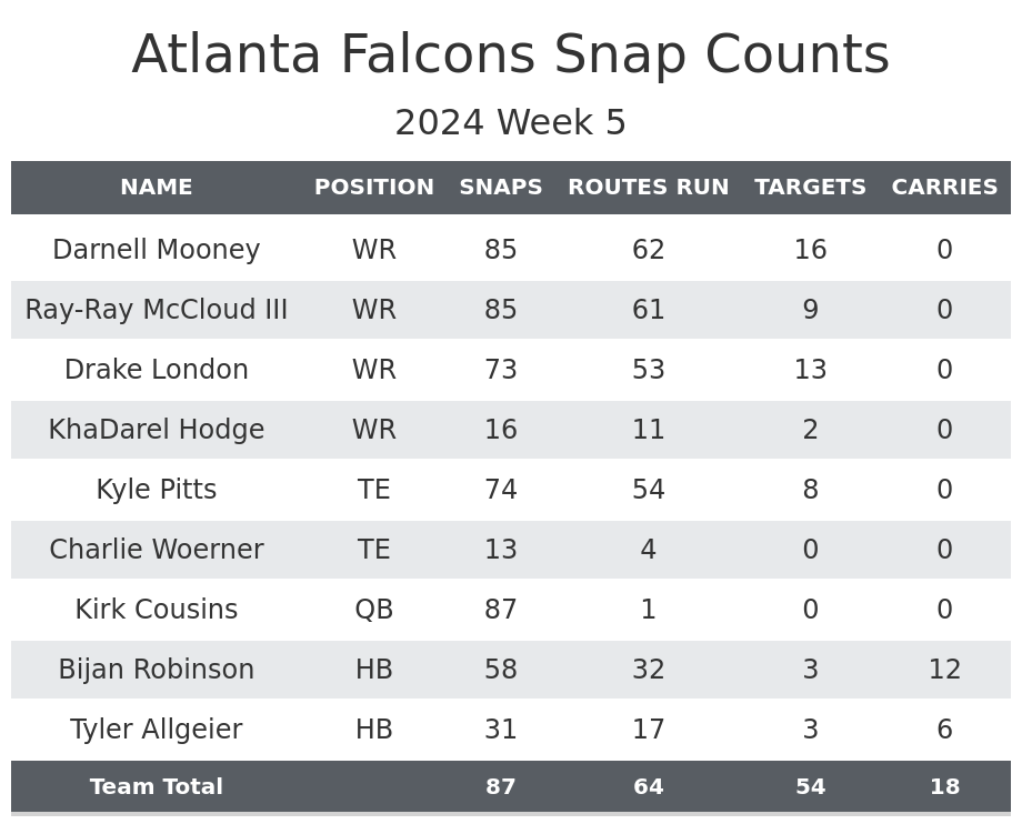 Pitts didn’t catch any of his targets last week, and his playing time has slowly but surely dropped each week. There had been a general tendency for Charlie Woerner to come in for run plays, but Woerner had run seven routes last week that could have gone to Pitts, whose role last week was still better than most tight ends in the league, but the downward trend was concerning.