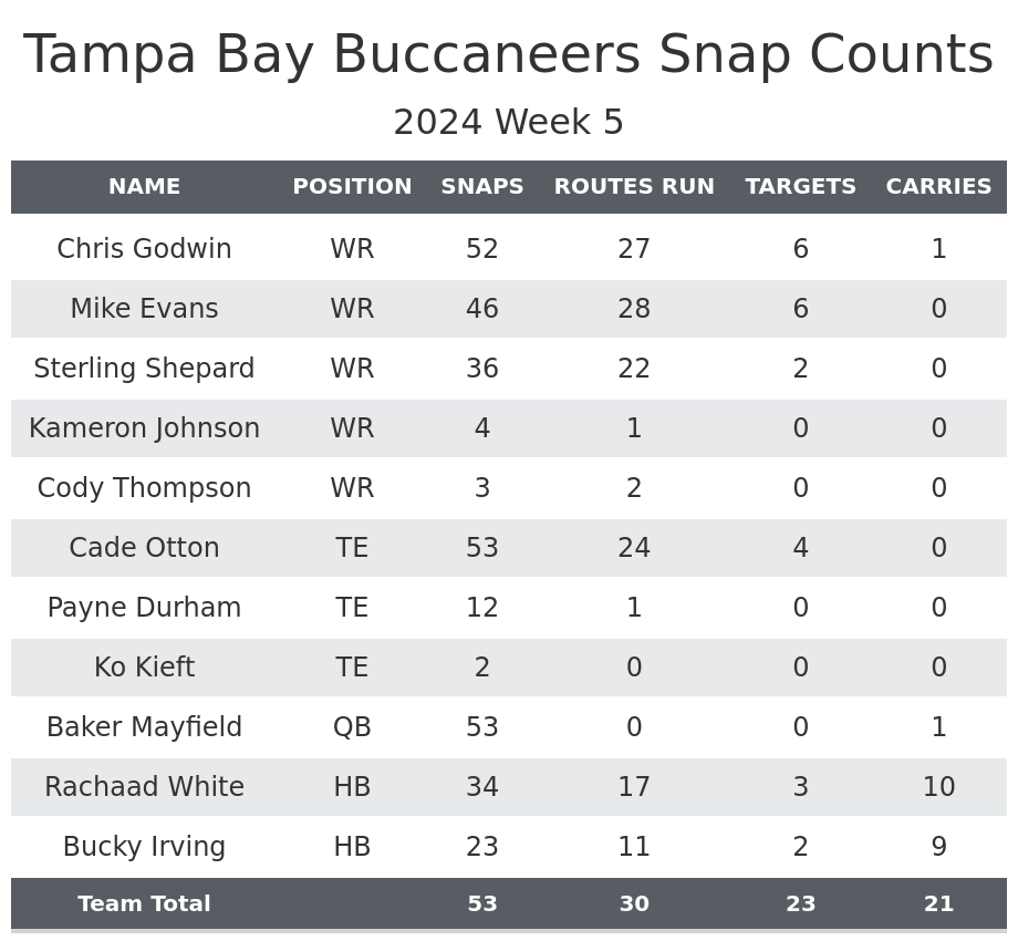 This left the team relying almost completely on their reliable weapons — Evans, Godwin and Cade Otton, although Shepard scored a touchdown. The Buccaneers' third wide receiver should largely be avoided in redraft leagues, but there is always a chance they could have a good game due to how much defenses need to focus on other wide receivers.