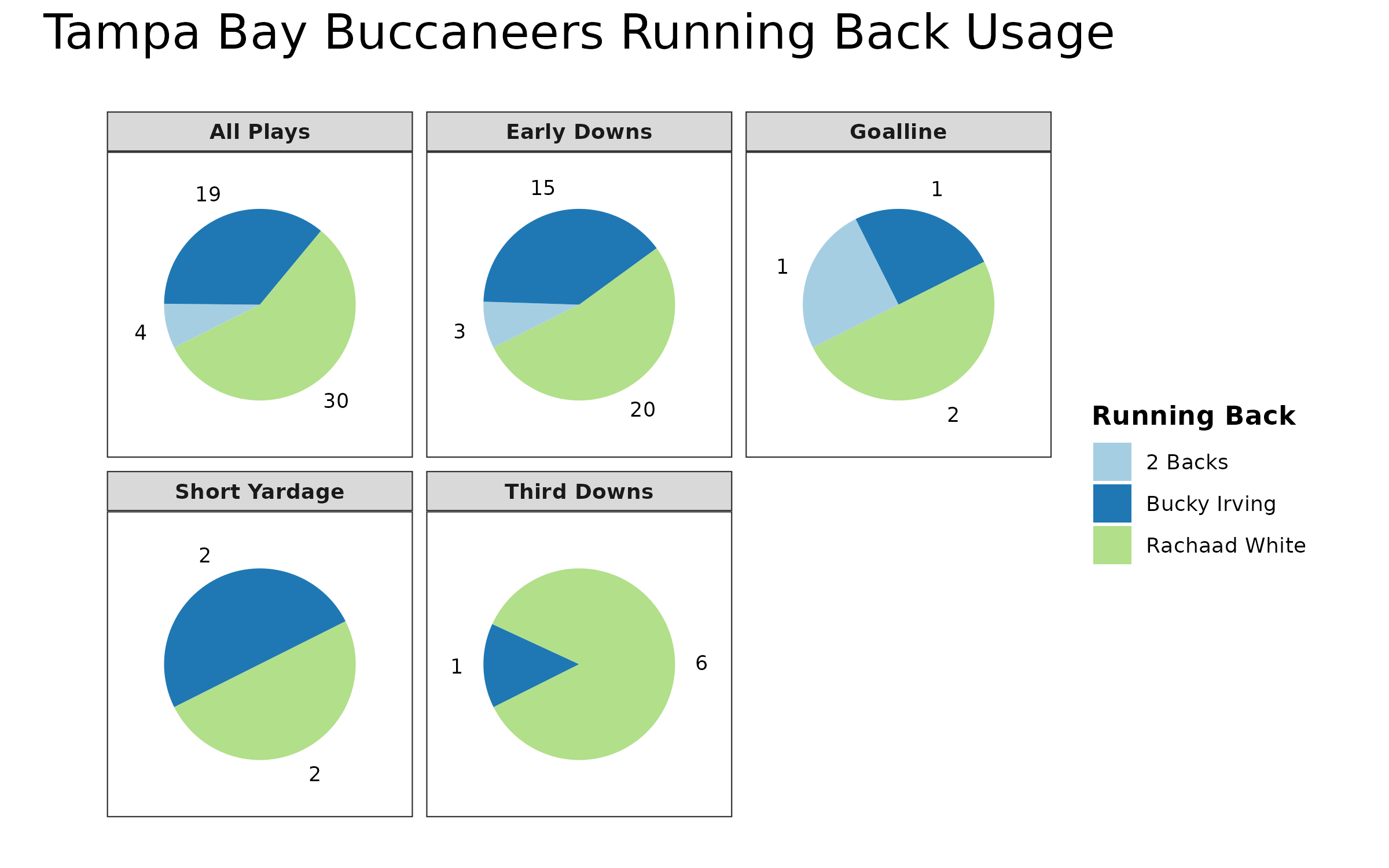 This week, the rotation was very similar to last week, as White played a little more than Irving on early downs while the two split short-yardage situations. The biggest difference in their usage from last week to this is that White was consistently on the field on third-and-medium or third-and-long situations, which wasn’t the case last week.