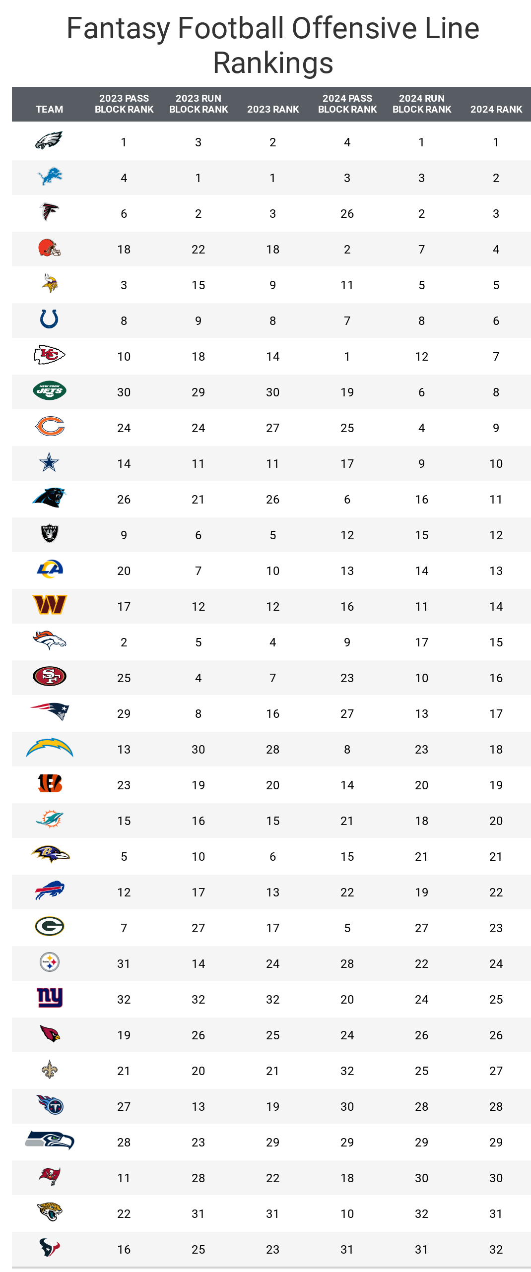 Today, we’ll examine an offensive line's impact on fantasy points and rank each offensive line to see which players might see a change in their performance based on their team's offensive line changes from the offseason.