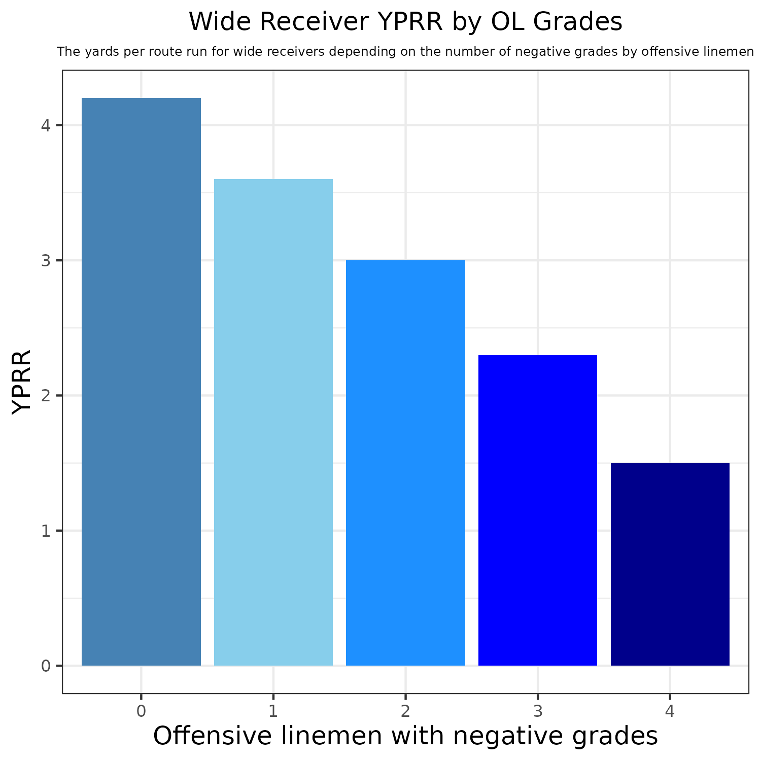 It’s worth noting that it’s incredibly rare for more than three offensive linemen to receive a negative grade on a play, so the sample sizes at four and five are very small. This relationship between pass blocking and wide receiver performance remains true on the team level. It’s also worth noting this is the yards for any of the wide receivers on a play rather than a specific wide receiver, where typically we view yards per route run by specific wide receivers.