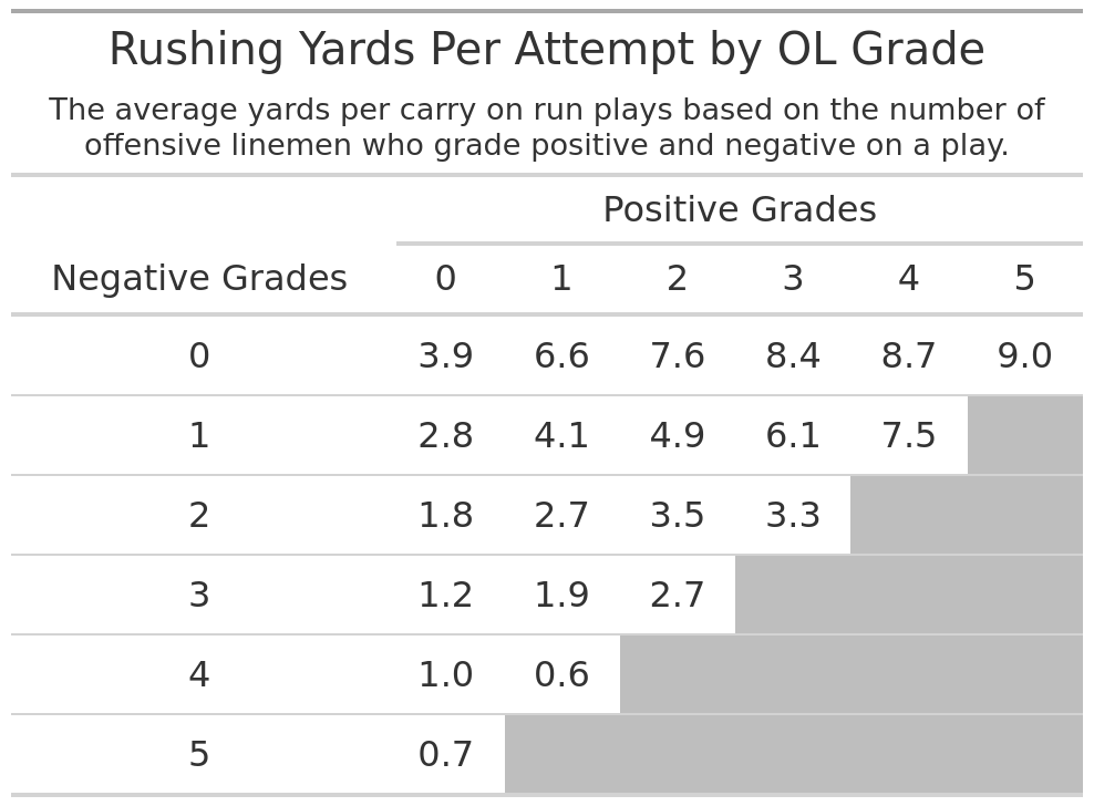 In general, it’s more important for offensive linemen to have more non-zero blocks than all zero blocks because positive blocks could lead to long runs whereas negative blocks, at worst, lead to a couple yard loss. For example, if a team had one play with a positive block and no negatives followed by one with one negative block and no positives, they would gain 9.4 yards while two plays with no grades would average 7.8 yards.