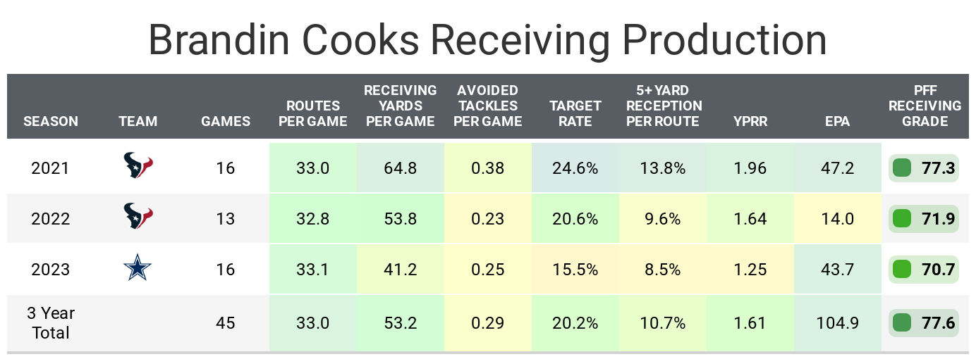 It took a few weeks for Cooks to start producing in the Dallas Cowboys offense last season, but he scored the 24th-most fantasy points for a wide receiver from Week 6 until the end of the season. The offense has lost some of its receiving production and didn’t bring in much to replace them, which should put more emphasis on the other Cowboys receivers. A lot of Cooks’ fantasy production came from touchdowns which is bound to regress, but three of his best four games in terms of targets and receptions came in the last three weeks of the season, including the playoffs. If Cooks can continue that momentum into the 2024 season, he will be one of the biggest steals of the draft.