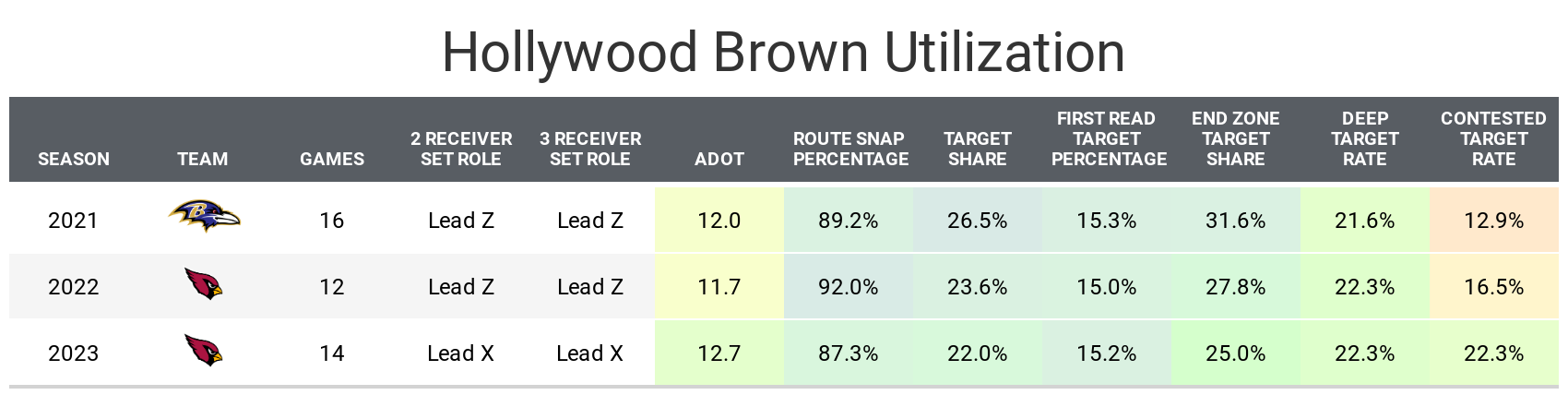 Brown was a top-21 fantasy wide receiver in PPR points per game in 2021 and 2022, but his 2023 role changed after the Arizona Cardinals moved on from DeAndre Hopkins. That and the quarterback situation resulted in a lack of production in 2023, but he has an opportunity for a huge season with the Kansas City Chiefs. Brown is consistently near the top of our separation metrics, which could make him a perfect pairing for Patrick Mahomes. Xavier Worthy’s playing time in the preseason, along with Brown’s injury, has pushed Brown’s ADP by a few rounds, making him a value at his current price.