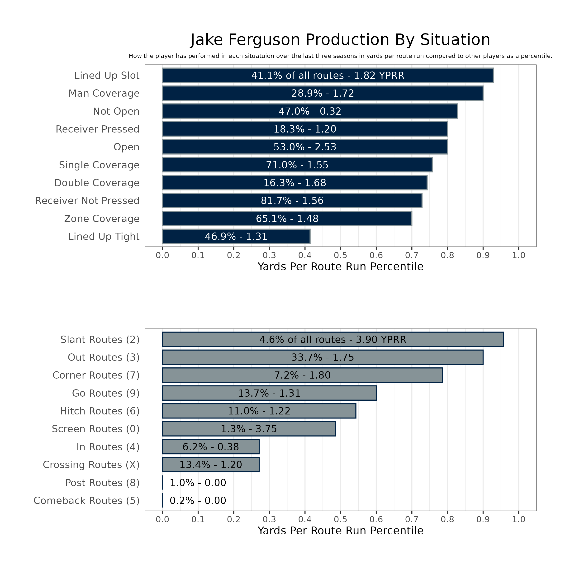 Ferguson had a slow start to the season with 15 or fewer yards in three of his first six games, but from Week 8 on after the Cowboys' bye week, he was a consistent producer. He was TE7 from that point on with 11.8 fantasy points per game. All of the stats shown in these tables and graphs are for the regular season only, but it’s worth noting he had by far the best game of his career in the wild card round, as he caught 10 passes for 93 yards and three touchdowns.