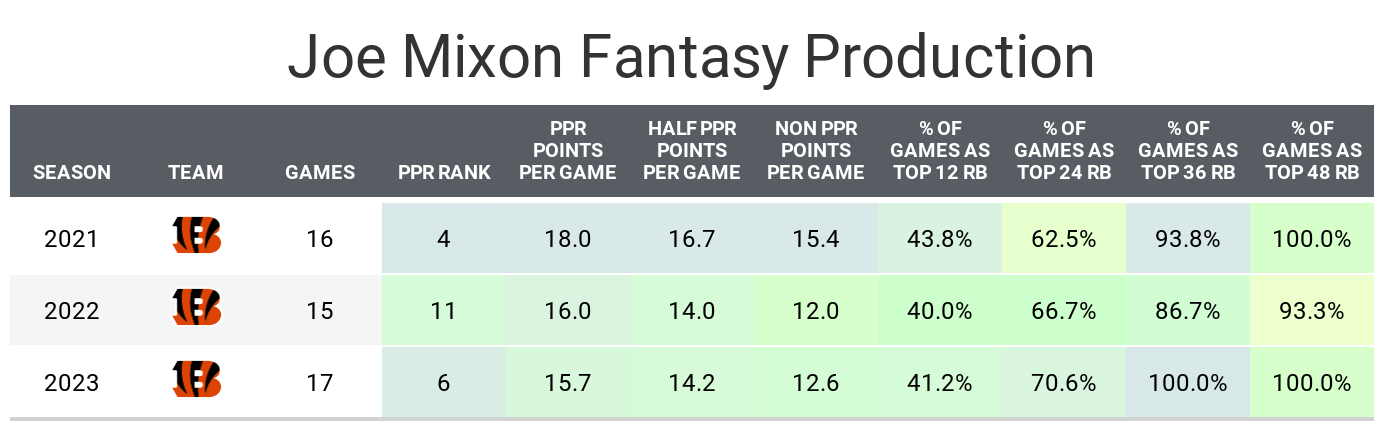 Mixon has been a consistent top-12 fantasy running back in both total ranking and points per game. Although he enters a new environment in 2024, he will play in a high-scoring offense as the Houston Texans‘ clear lead running back. While he’s never been the most explosive runner, it’s fair to think he will finish in the top 12 yet again. Offensive coordinator Bobby Slowik recently said Mixon is “an absolute workhorse, in every regard.” The offenses Slowik has been part of generally run the ball more than average, which should continue to be true with Mixon.