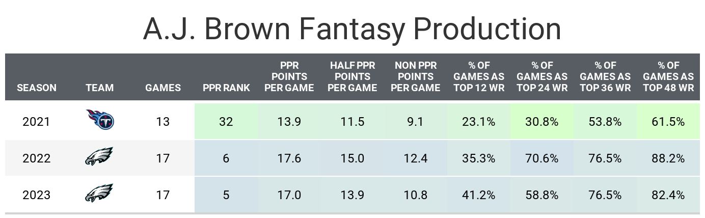 Brown has been a consistently elite wide receiver throughout his career, although he doesn't run an elite number of routes. He and Jefferson are the only wide receivers who have averaged 2.5 yards per route run or better on at least 300 routes in each of the past three seasons. Tyreek Hill and Jaylen Waddle are the only other players who have done this twice in the past three years.