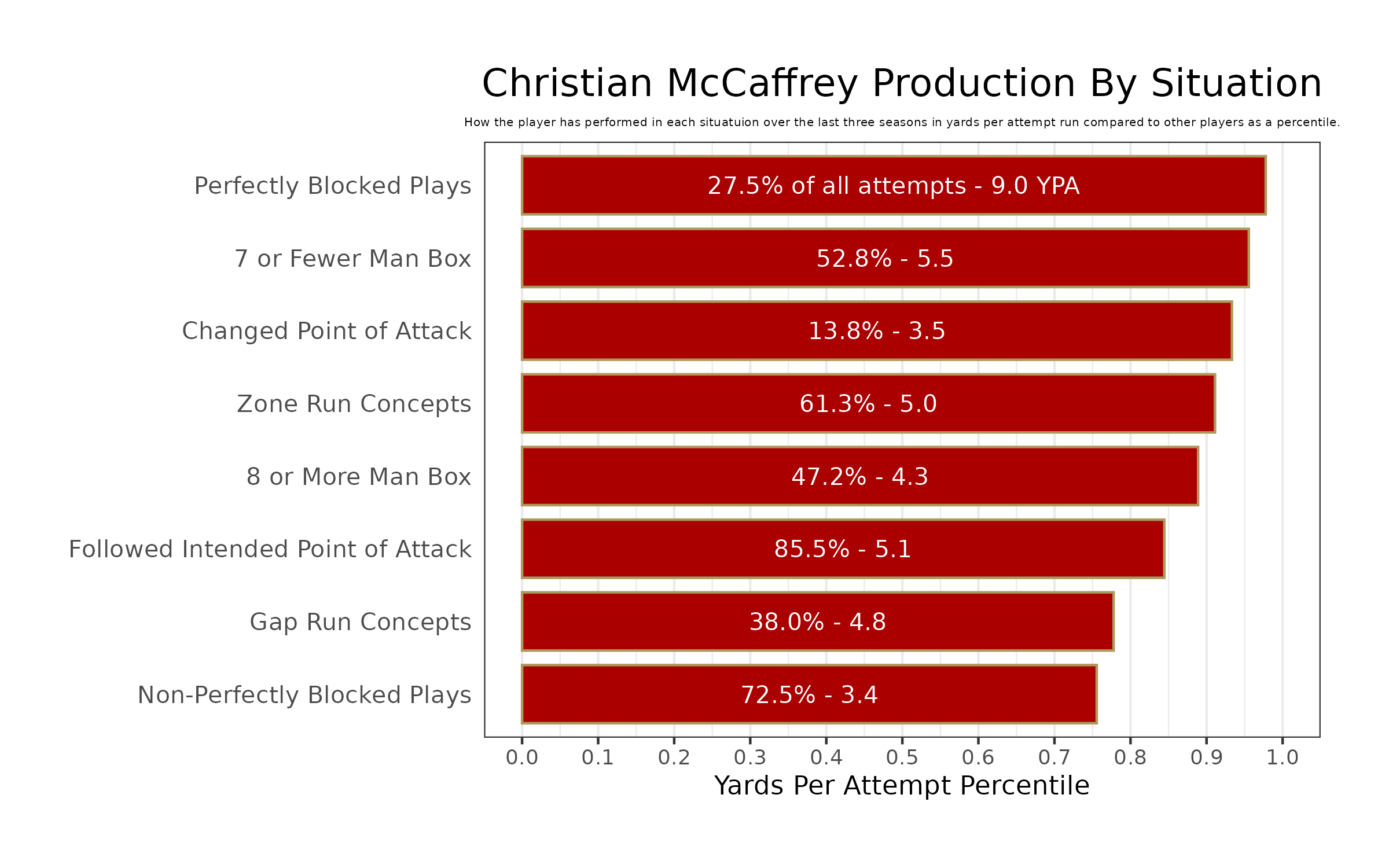 McCaffrey should be the 1.01 because he is far ahead of his competition. He has the right combination of volume and efficiency in both the run and pass game, as well as continuity with everyone on the offense. Like any player, there is risk, but given how far apart McCaffrey is from all other running backs, even worse production could still lead to an RB1 season. He was relied on in the run game more than in the last couple of seasons, and he matched the increased volume with increased efficiency. He was among the top running backs in the run game in every volume and efficiency metric. When he has a perfectly blocked play, he’s averaged an absurd 9.0 yards per carry over the last three seasons.