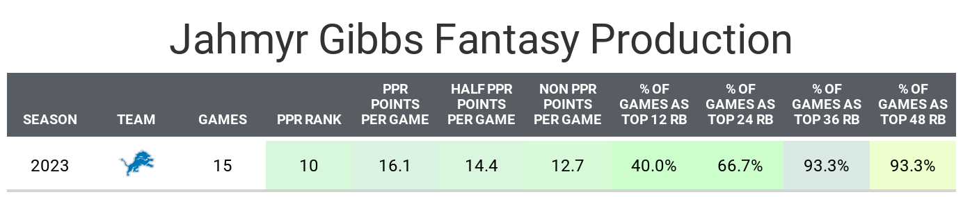 Gibbs consistently excelled in ideal situations. On perfectly blocked plays, when he could follow his intended point of attack and against seven or fewer men in the box, he ranked between the 95th and 99th percentile in PFF rushing grade. He finished eighth in PPR points last season. It’s hard for him to reach the Christian McCaffrey level without more rushing attempts per game, but there is reason to believe his fantasy points can improve with either more touches, improved production in the receiving game and/or the offensive line helping him even more than before.