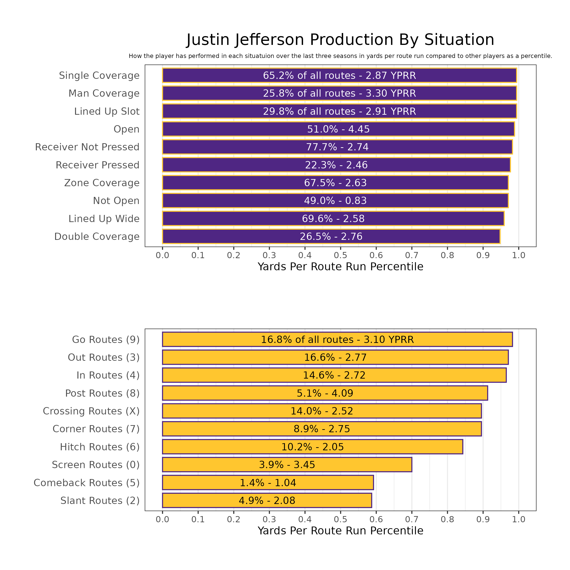 Gibbs consistently excelled in ideal situations. On perfectly blocked plays, when he could follow his intended point of attack and against seven or fewer men in the box, he ranked between the 95th and 99th percentile in PFF rushing grade. He finished eighth in PPR points last season. It’s hard for him to reach the Christian McCaffrey level without more rushing attempts per game, but there is reason to believe his fantasy points can improve with either more touches, improved production in the receiving game and/or the offensive line helping him even more than before.