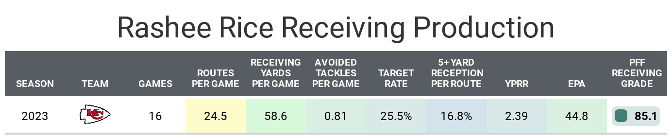 Rice finished as WR27 and was a top-36 wide receiver in nearly 70% of his games despite playing less than 70% of his team's offensive snaps in all but four games. By Week 14, he began receiving playing time comparable to a typical starting wide receiver, playing at least 75% of his team's offensive snaps from Weeks 14-17. During this period, he ranked eighth in fantasy points among wide receivers. In the playoffs, Rice played at least 75% of the Kansas City Chiefs‘ offensive snaps in three of four games, averaging 6.5 receptions for 65.5 yards per game against some of the NFL's best defenses.