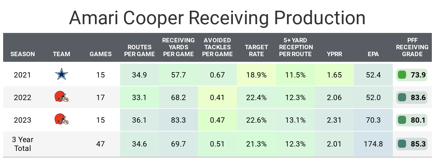 Cooper is in the 80th percentile or better in every situation he’s been put in over the past three seasons. It’s possible Cooper is a top-10 wide receiver in the NFL and has just never been given the right combination of target share and quarterback. He is very likely to be a fantasy starter all season if he stays healthy, but he is unlikely to be a top-15 wide receiver in fantasy points per game.