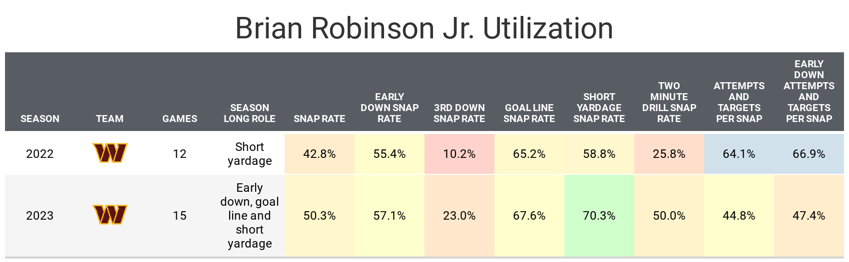 Robinson appears to be the primary running back in Washington, as he played 16 of 29 snaps with the starters in the preseason. He’s expected to handle most early-down work, while Austin Ekeler will likely take on passing-down duties. The Washington Commanders made a few offensive line changes that should help, and they are unlikely to be as pass-happy as last season.