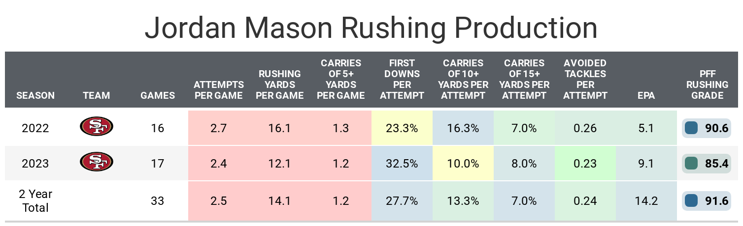 Mason has played so well that his 92.6 PFF overall grade over the past two seasons is the best among all running backs, regardless of sample size. Elijah Mitchell is out for the season, making Mason the top backup for Christian McCaffrey. If McCaffrey were to get injured, Mason would likely be a top-10 fantasy running back.