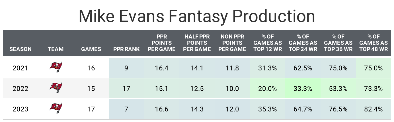 Godwin was a top-20 fantasy wide receiver in both 2021 and 2022, but his health was a concern in 2023, so the Tampa Bay Buccaneers kept him as an outside receiver rather than moving him to his traditional slot role in three-receiver sets.