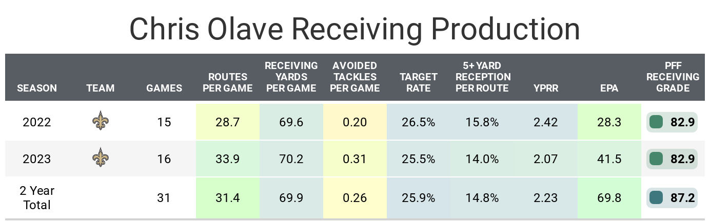 Olave has been an underrated wide receiver in his two years with the New Orleans Saints. His per-route production has been excellent. His 87.2 PFF receiving grade over his first two seasons ranks eighth among wide receivers over the past decade. Olave recently celebrated his 24th birthday, so we can still expect improvement from the budding superstar. He finished as the WR16 last season, and it’s fair to expect him to run more routes this year, leading to more production.