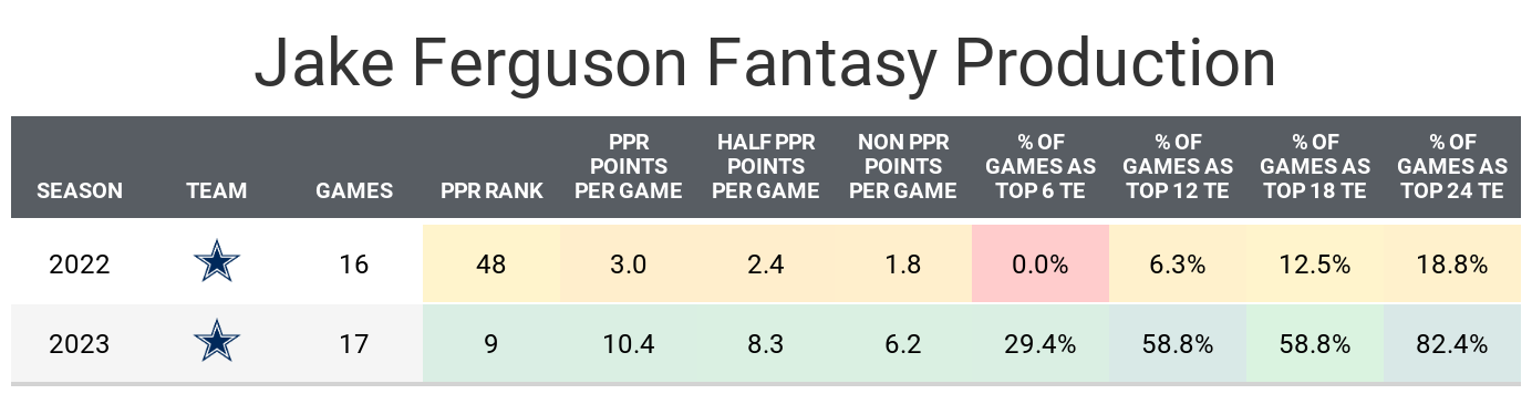 Ferguson had a slow start to the season with 15 or fewer yards in three of his first six games, but from Week 8 on after the Cowboys' bye week, he was a consistent producer. He was TE7 from that point on with 11.8 fantasy points per game. All of the stats shown in these tables and graphs are for the regular season only, but it’s worth noting he had by far the best game of his career in the wild card round, as he caught 10 passes for 93 yards and three touchdowns.