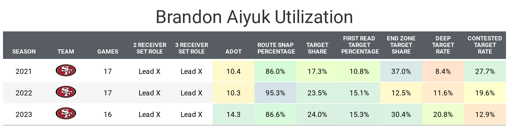 Aiyuk has been a very talented receiver held back by the 49ers' run-first offense and quarterback situation. This past season Aiyuk was unleashed with Brock Purdy. His average depth of target and deep target rate shot up, allowing him to finish at WR12 despite how often the 49ers run with the ball.