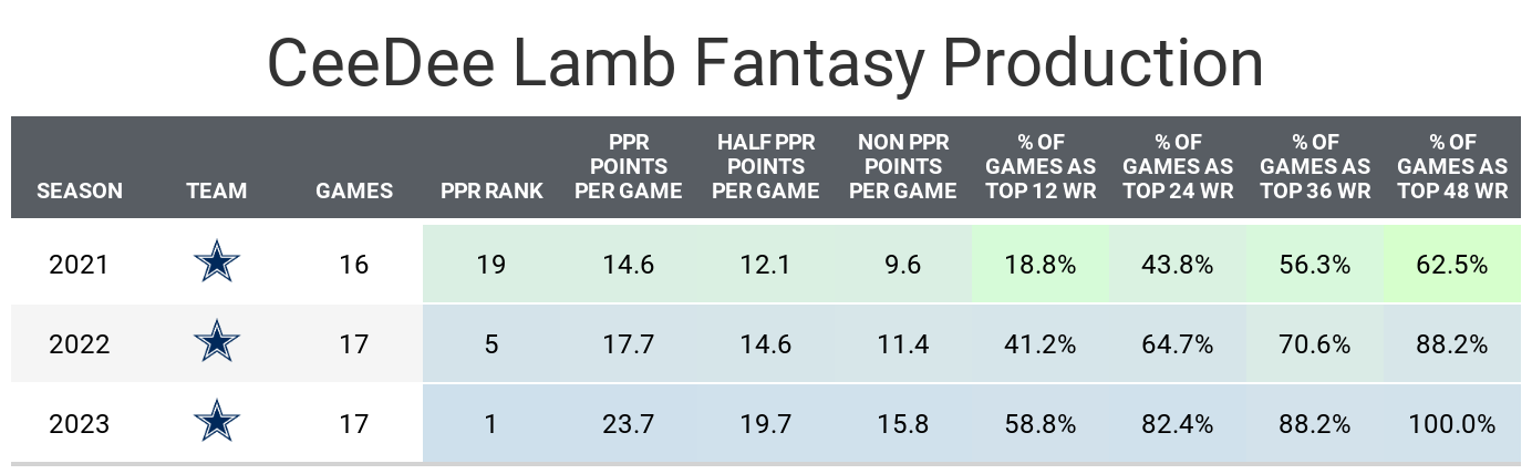 Lamb noticeably improved each season and now, he’s at the top of the position. He finished last season as the top wide receiver and has less competition for targets this season after Tony Pollard and Michael Gallup‘s departure. The only notable addition is sixth-round receiver Ryan Flournoy, which will have no impact on Lamb’s target share.