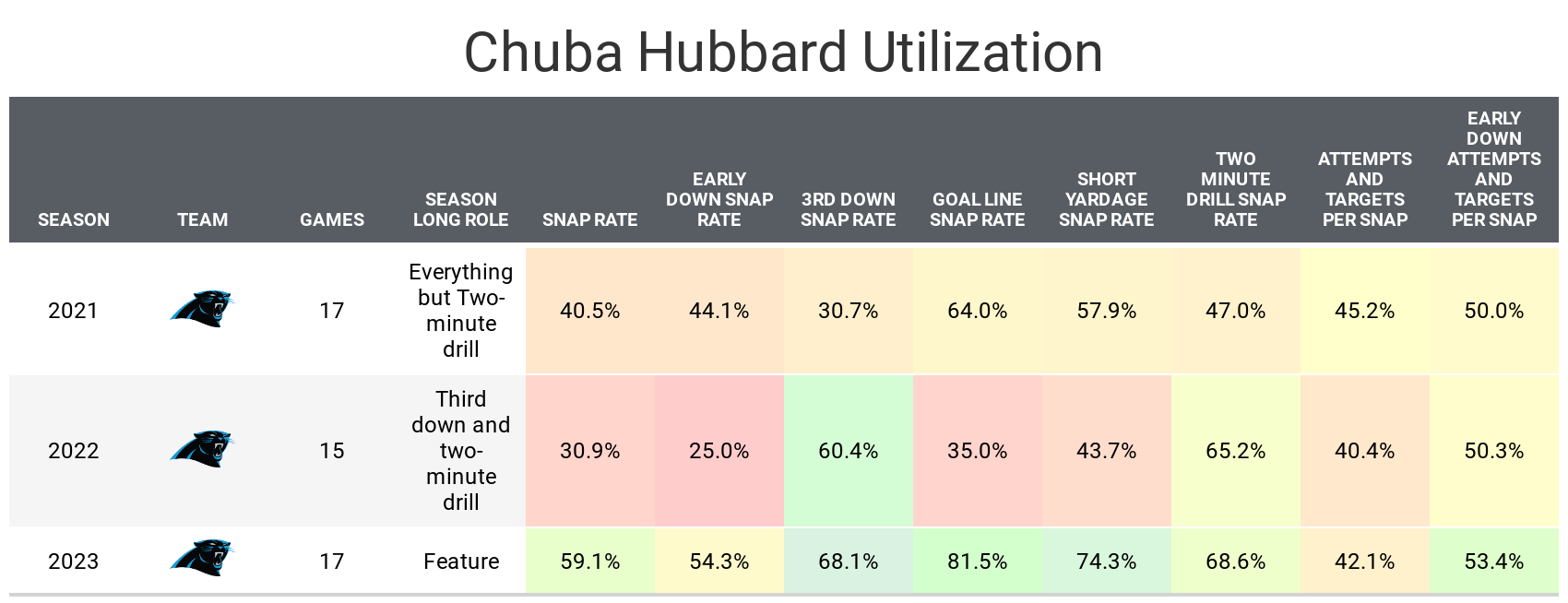 Hubbard was used in a variety of situations in his first two seasons, and his role increased significantly for the 2023 season, playing at least 64% of his team's offensive snaps in each of his last seven games. He finished at least RB28 or better in each of those games including two weeks as a top-12 running back.