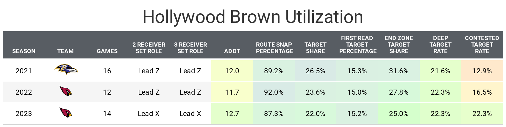 Brown was a top-21 fantasy wide receiver in PPR points per game in 2021 and 2022, but his 2023 role changed after the Cardinals moved on from DeAndre Hopkins. That and the quarterback situation resulted in a lack of production in 2023, but he has an opportunity for a huge season with the Kansas City Chiefs. Brown is consistently near the top of our separation metrics, which could make him a perfect pairing for Patrick Mahomes. Considering how slowly the Chiefs have brought on rookie wide receivers in the past as well as Rashee Rice’s legal situation, Brown could be the top wide receiver for Mahomes this season.